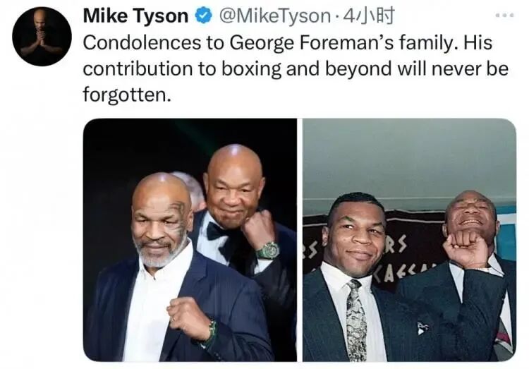 泰森晒出了两张他与福尔曼的合影并悼念写道:向乔治·福尔曼的家人表示哀悼。福尔曼对于拳击以及其他领域的贡献,永远不会被忘记。