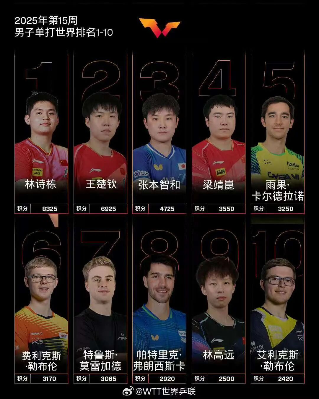 据悉,4月8日,@WTT世界乒联 发布国际乒联2025年第15周世界排名。男子单打,林诗栋保持排名第一。