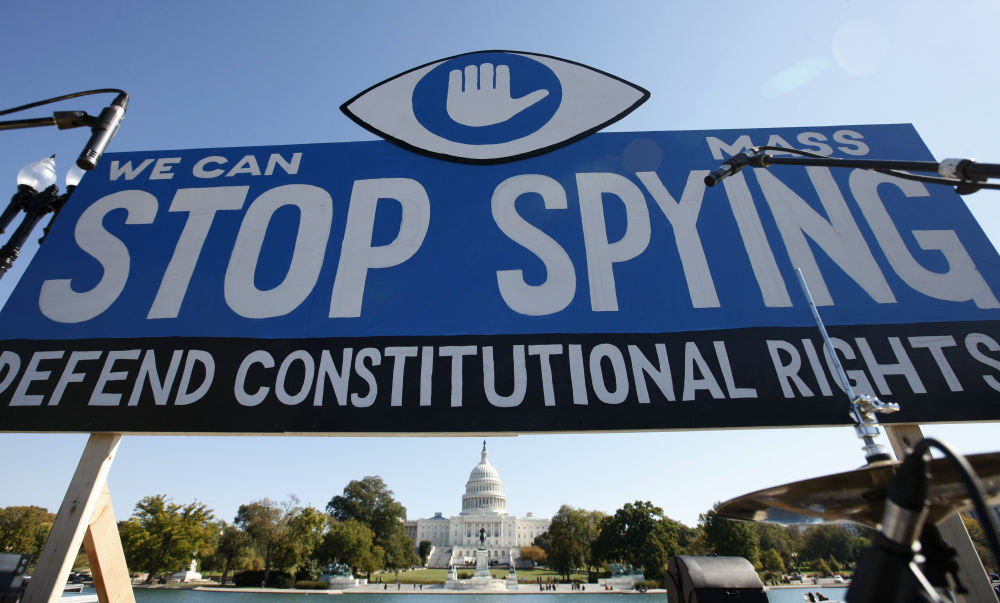 2013年10月26日,在美国首都华盛顿,一个反监控的标语牌竖立在国会大厦前。新华社记者 方喆 摄
