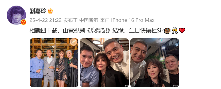 4月22日晚,刘嘉玲晒合照配文:“相识四十载,由电视剧《鹿鼎记》结缘,生日快乐杜Sir。”