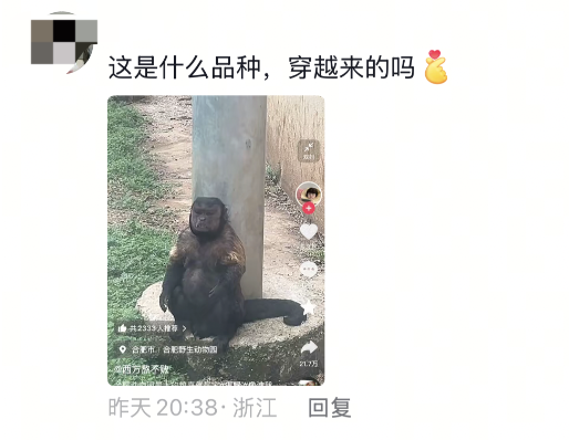 据合肥野生动物园的工作人员介绍,黑帽悬猴天生一头“黑发”, 像是戴着一顶小帽子,网红“国字脸”搭配与人高度相似的长相,加上表情还特别丰富,一直深受游客喜爱。