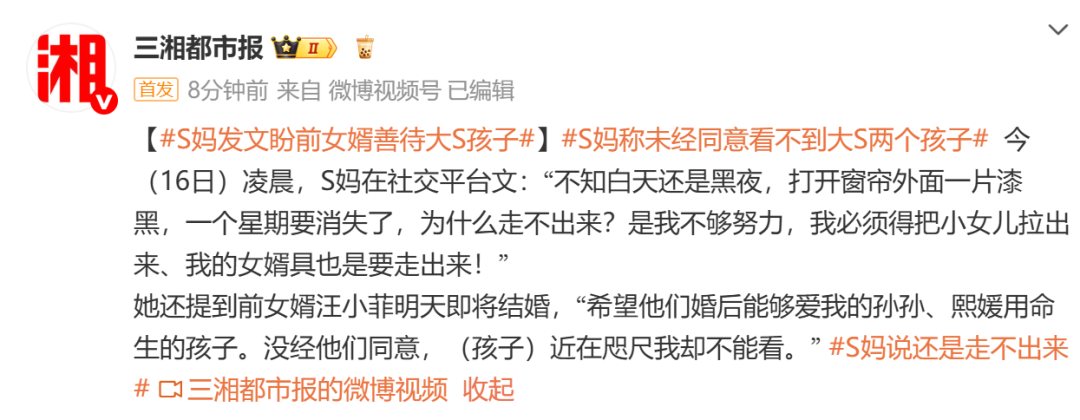 5月16日,据三湘都市报,S妈凌晨在社交平台文:“不知白天还是黑夜,打开窗帘外面一片漆黑,一个星期要消失了,为什么走不出来?是我不够努力,我必须得把小女儿拉出来、我的女婿具也是要走出来!”