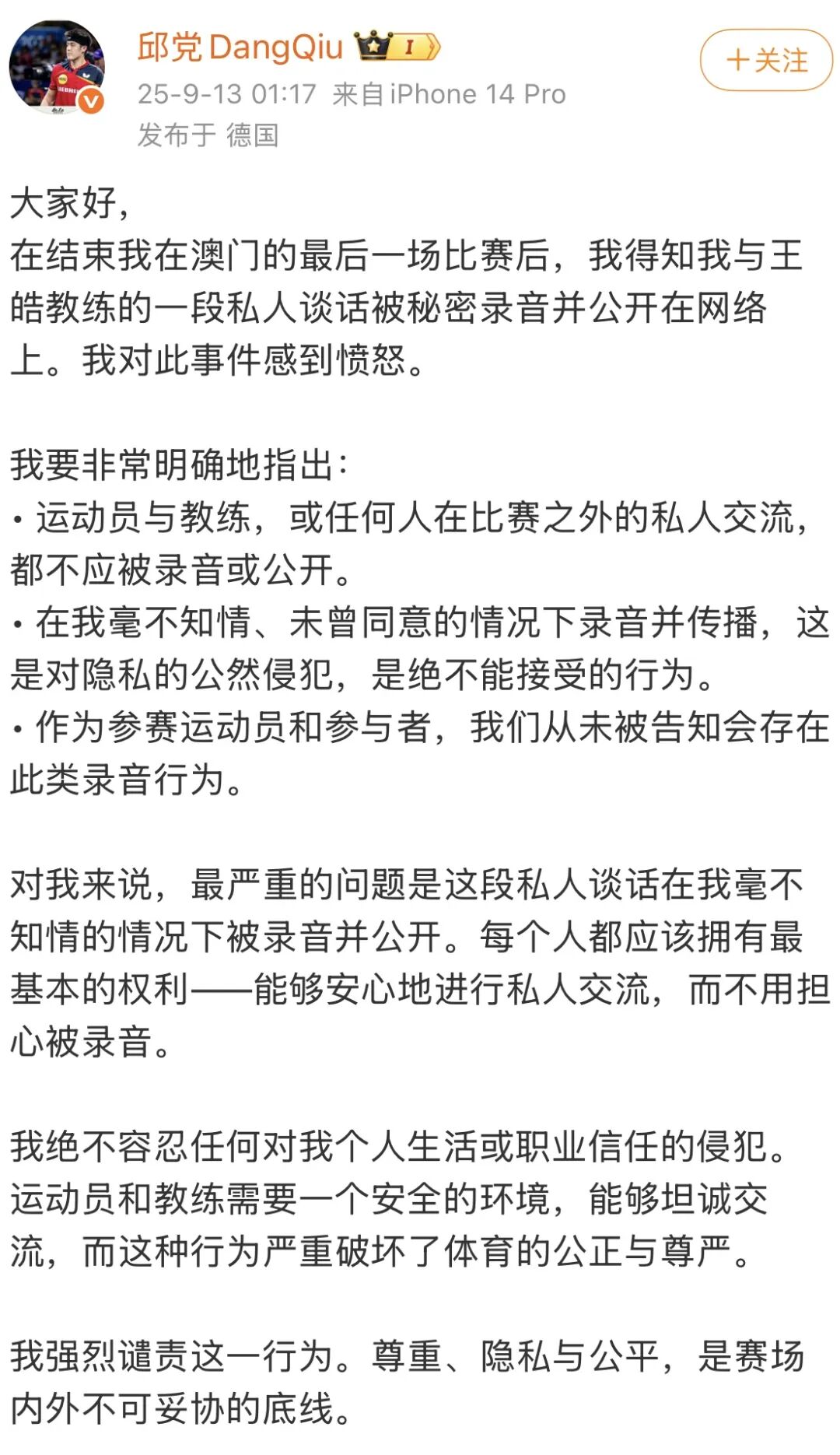 据媒体报道,近日WTT澳门冠军赛期间,德国乒乓球运动员邱党与国乒男队主教练王皓的一段对话被公布到网上,两人谈论樊振东在德国打球的一些情况。