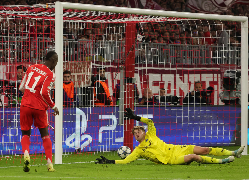 10月22日,拜仁慕尼黑队球员雅克松(左)在比赛中射门得分。新华社发(菲利普·鲁伊兹摄)