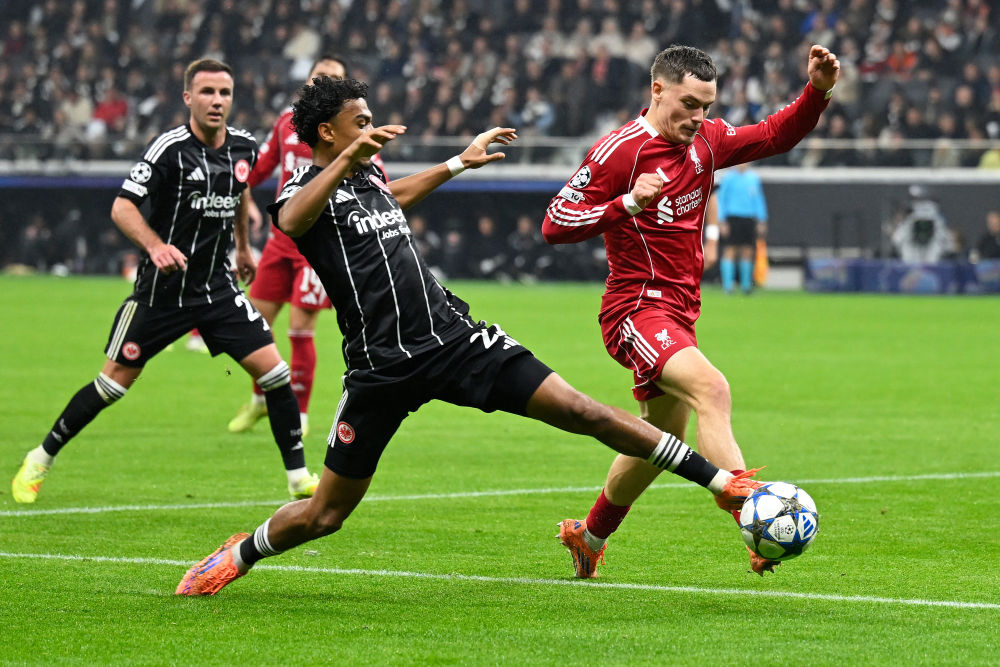 10月22日,法兰克福队球员布朗(中)与利物浦队球员沃茨(右)拼抢。新华社发(乌尔里希·胡夫纳格尔摄)