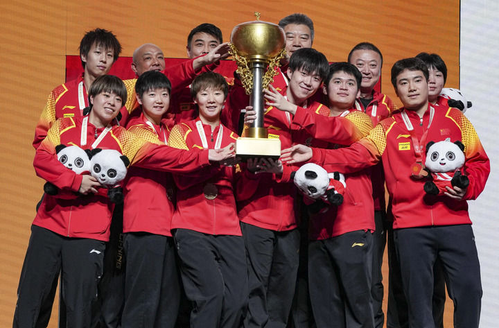 在四川成都举行的2024年国际乒联混合团体世界杯颁奖仪式,中国队获得冠军后合影(资料图)。