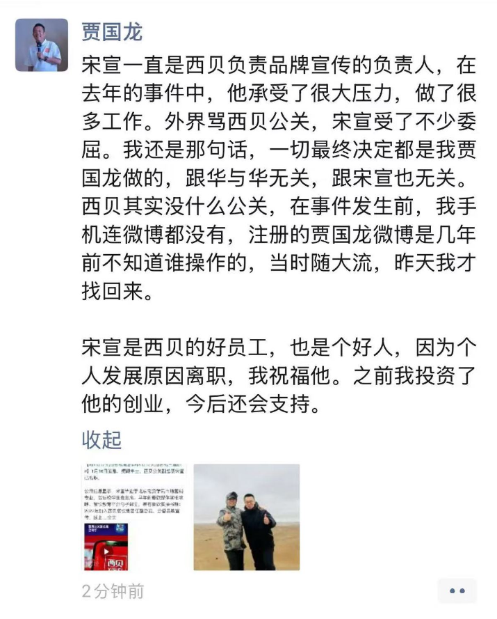 1月16日,界面新闻获悉西贝公关副总裁宋宣已离职。西贝餐饮创始人贾国龙在个人朋友圈发文称,宋宣因为个人发展原因离职,“在去年的事件中,他承受了很大压力,做了很多工作。”宋宣也在个人微信朋友圈称,“此时还在一线,永远是西贝人”。