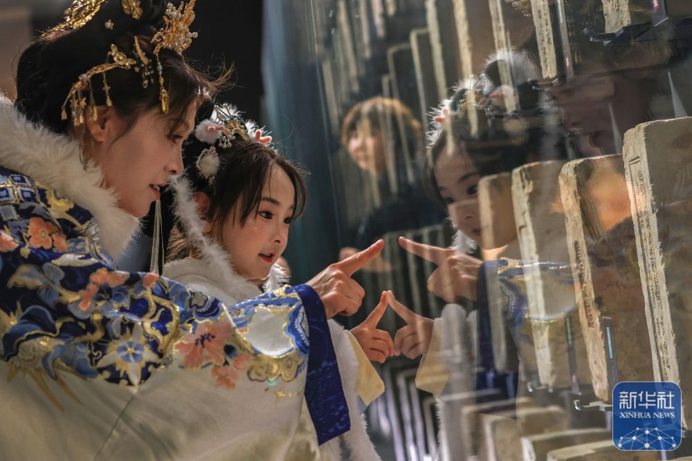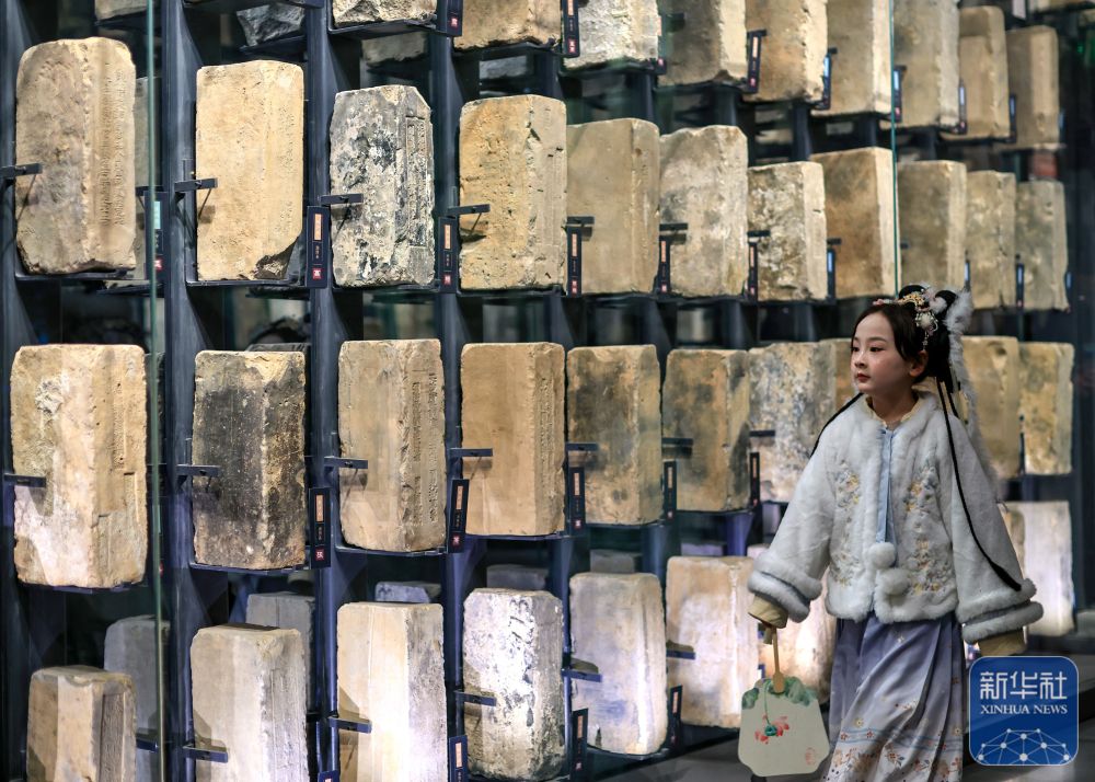 ↑ 2月14日,一名身着传统服装的小朋友在南京城墙博物馆参观。新华社发(辛一 摄)