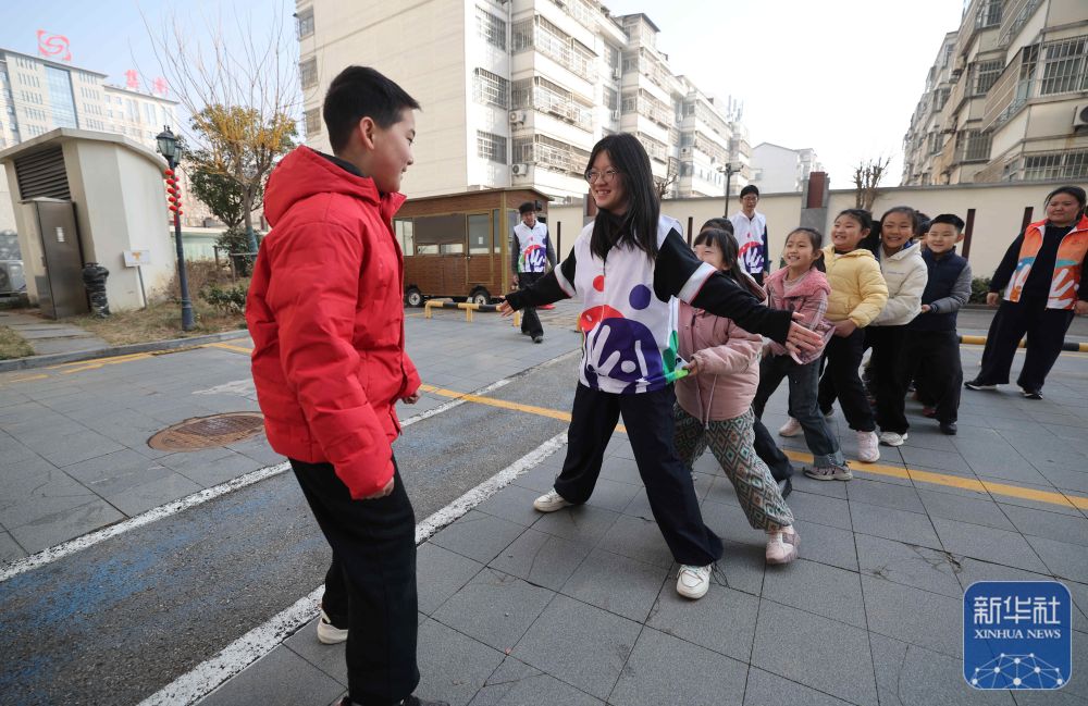 ↑ 2月14日,在山东省临沂市沂南县,青年志愿者带领小朋友玩老鹰捉小鸡游戏。新华社发(王彦冰摄)