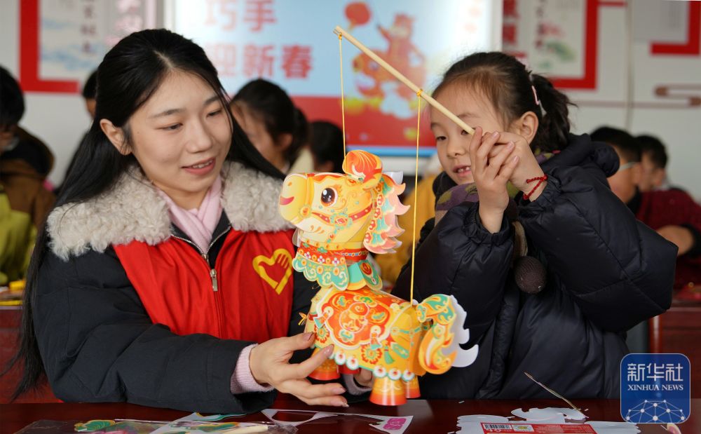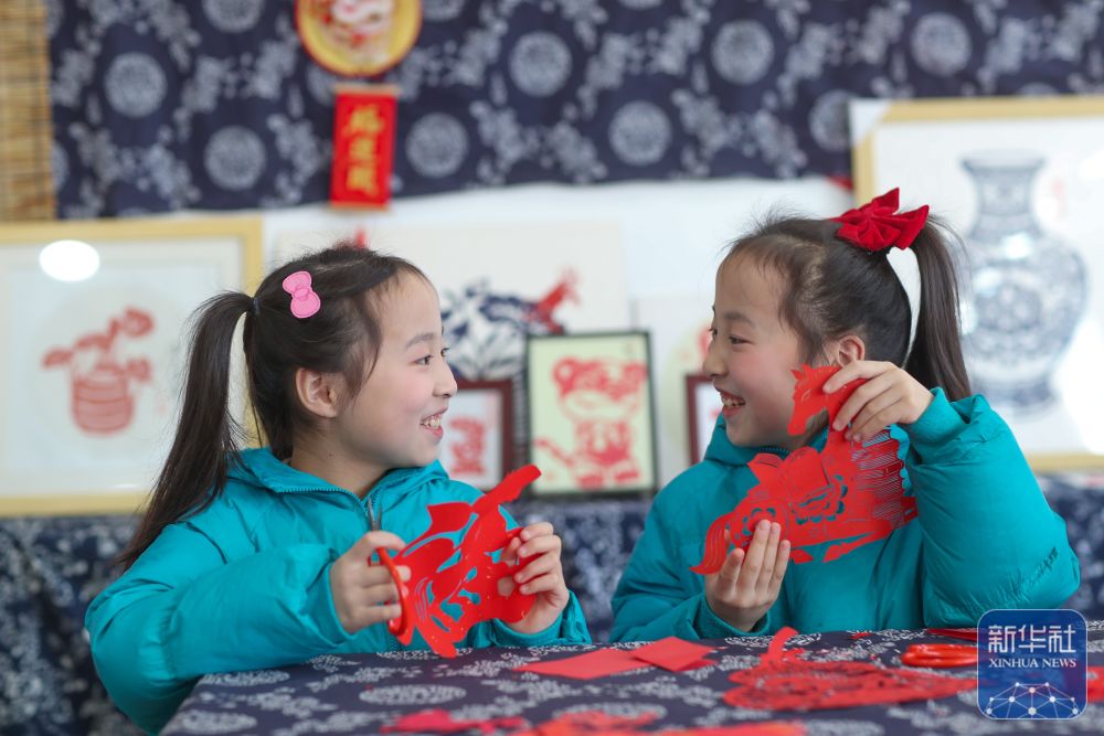 ↑ 2月14日,在江苏省兴化市垛田街道乡村非遗艺术馆,孩子们在老师的指导下创作以生肖马为主题的剪纸。新华社发(周社根摄)