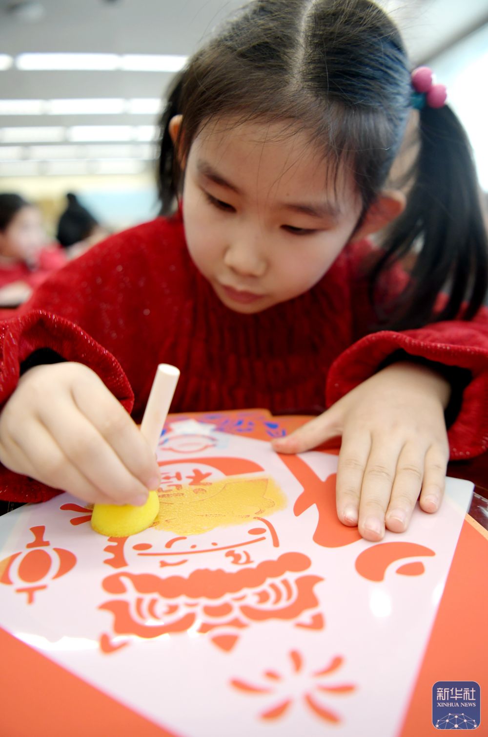 ↑ 2月11日,在河南省鹤壁市图书馆,一名小朋友制作手工拓印作品。新华社发(赵永强摄)