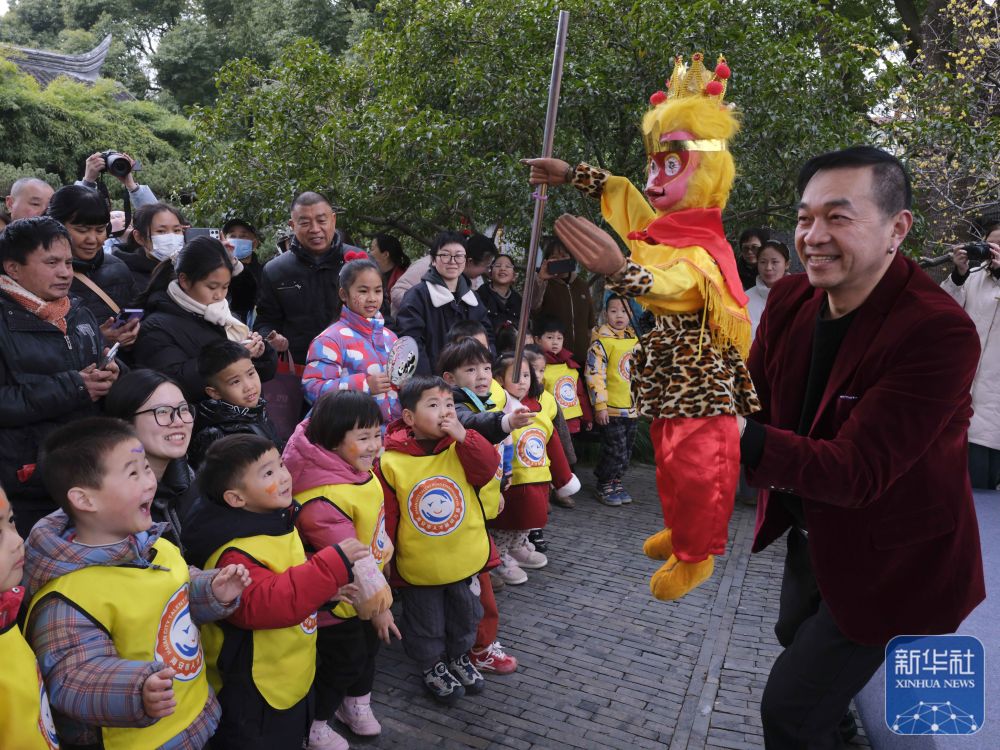↑ 2月10日,文化志愿者在江苏省海安市博物馆内给小朋友表演木偶戏。新华社发(徐劲柏摄)