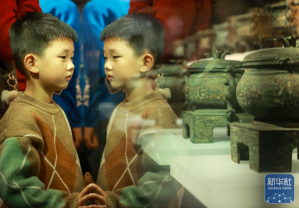 ↑ 2月14日,小朋友在湖北省博物馆参观文物。新华社发(赵军摄)