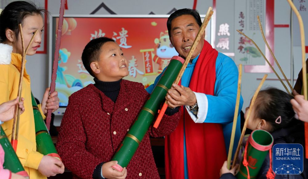 ↑ 2月13日,文化志愿者在江苏省海安市墩头镇墩西村教寒假公益托管班的学生学唱省级非遗“水乡道情”。新华社发(周强摄)
