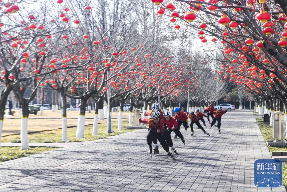 ↑ 2月11日,孩子们在河南省济源市世纪广场樱花路上练习轮滑。新华社发(苗秋闹摄)