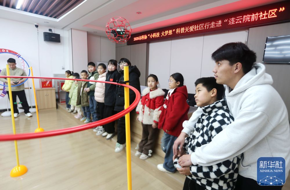 ↑ 2月12日,在江苏省连云港市连云区墟沟街道院前社区爱心托班,科普志愿者教小朋友操作无人机。新华社发(王春摄)