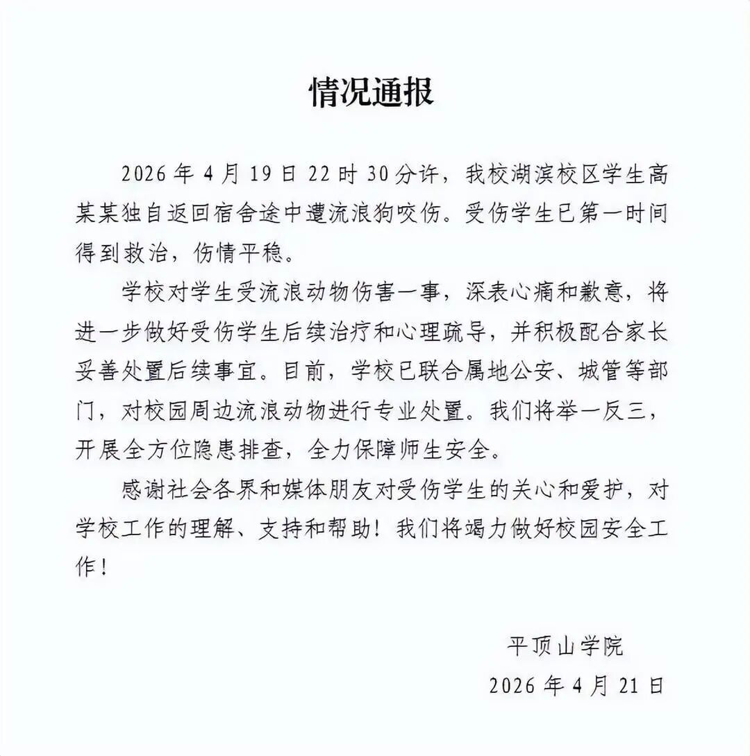 4月21日晚,平顶山学院发布通报 :2026年4月19日22时30分许,我校湖滨校区学生高某某独自返回宿舍途中遭流浪狗咬伤。受伤学生已第一时间得到救治,伤情平稳。