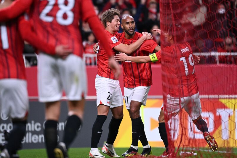 11月29日,浦和红钻队球员何塞·坎特(右二)庆祝进球。(图片来自亚足联官网)