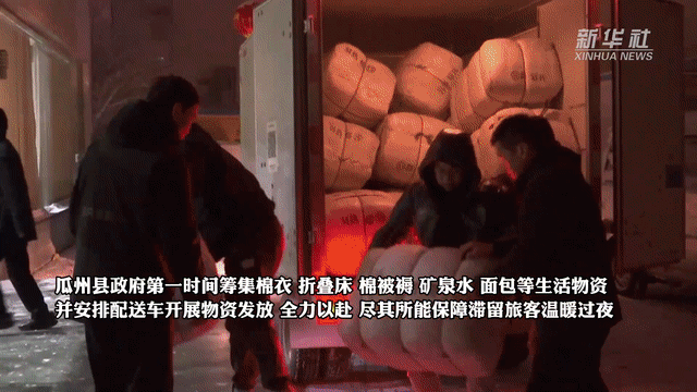 瓜州县公安、消防、交通、应急、街道等各部门和单位迅速行动。1000多件棉衣,以及4000多人份的泡面、大饼、矿泉水等物资迅速调拨到位,分发到滞留人员手里。