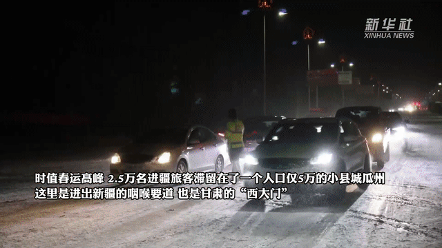 “17日下午,越来越多的车辆开始在县里公共场所扎堆聚集,街道上外地牌照的车辆密密麻麻一眼望不到头,很多找不到旅馆的滞留人员只能选择在车里过夜。”瓜州县渊泉镇榆林社区党委书记高亚军说,接到镇政府通知,他召集社区干部走上街头,保障滞留人员温暖过夜。