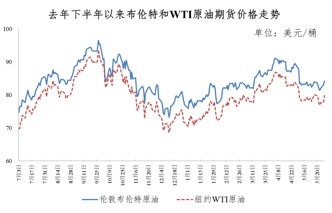 本轮成品油调价周期内国际油价窄幅震荡 调价周期内,全球原油需求预期减少、美国原油库存增长,但中东地缘冲突再起,多重因素共同作用下油价震荡运行。 美联储维持当前利率政策,甚至宣称不排除加息可能,对经济增长及原油需求前景造成打压,国际能源署、美国能源信息署均下调了今年石油需求增速预期。但中东地缘政治局势再度紧张,以色列持续袭击加沙地带南部城市拉法,并与埃及在边境发生交火,增加原油市场“风险溢价”。 此外,投资机构预测“欧佩克+”延续减产措施到三季度,也对油价产生提振。多重因素影响下,国际油价呈现窄幅波动走势。