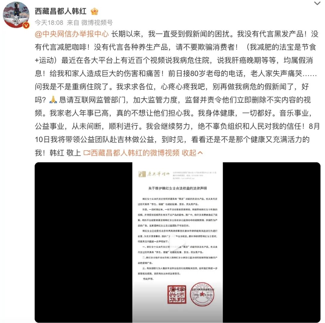 8月6日,知名歌手韩红发微博称一直受到假新闻的困扰,并辟谣了一些网上热传的信息: