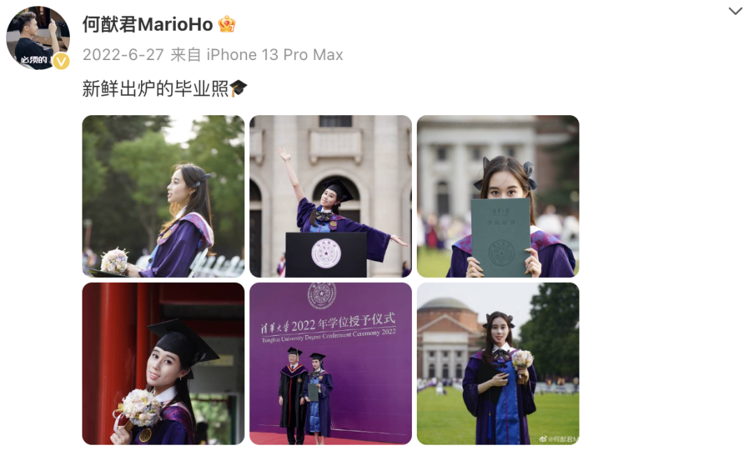 2022年何超欣的哥哥何猷君晒出她参加从清华大学毕业的照片。