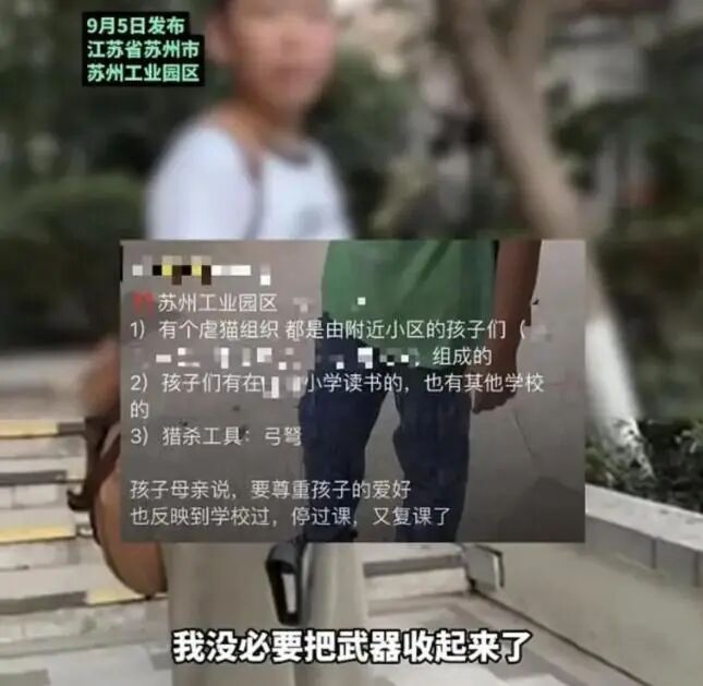 9月5日,江苏苏州。一网友发布视频,在小区发现一男孩手持弓弩虐杀猫,询问中男孩自曝以杀猫为傲,并且准备在网上买猫笼或者自动杀猫机,之前还曾猎杀过一只猫,但不确定猫是否死掉。