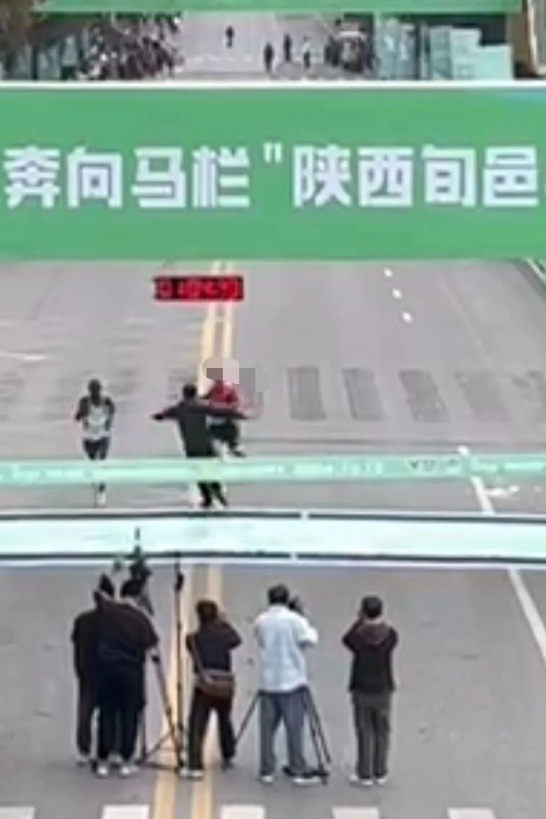 10月13日,网上一段视频引发关注。该视频显示,陕西旬邑半程马拉松赛的终点处,一名选手正在进行最后冲刺。突然一名红衣男子从侧面窜出,跑向冲刺选手,欲抢镜头捣乱。旁边工作人员看到后,上前将红衣男子拦住。