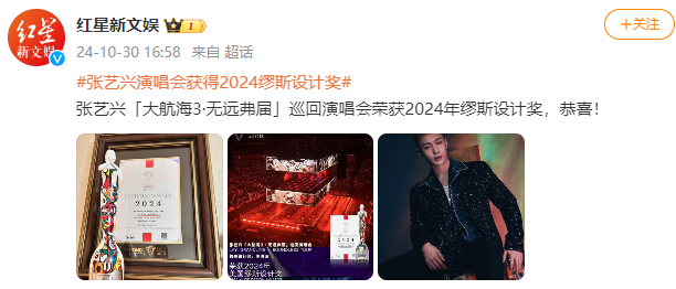 10月30日,据红星新闻文娱号消息,张艺兴「大航海3·无远弗届」巡回演唱会荣获2024年缪斯设计奖。