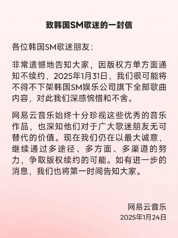 1月24日,@网易云音乐 发布《致韩国SM歌迷的一封信》,称:因版权方单方面通知不续约,2025年1月31日,我们很可能将不得不下架韩国SM娱乐公司旗下全部歌曲内容。