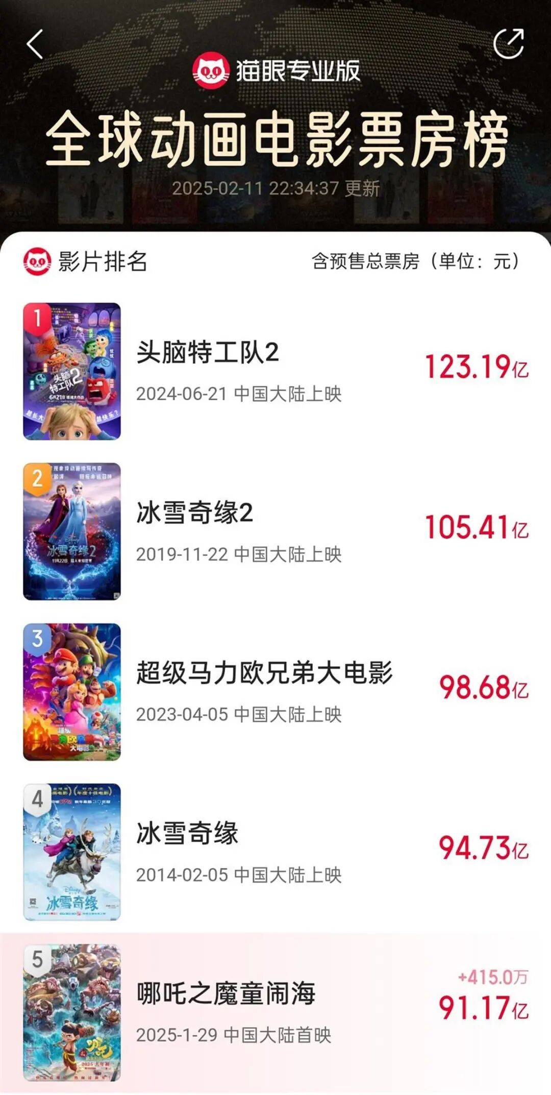 此外,在全球动画电影榜单中,《哪吒之魔童闹海》也以91.17亿元的票房排名第五。目前,排名第一的是《头脑特工队2》,票房为123亿元,排名第二的是《冰雪奇缘2》,票房为105亿元,排名第三的是《超级马力欧兄弟大电影》,票房为98亿元。