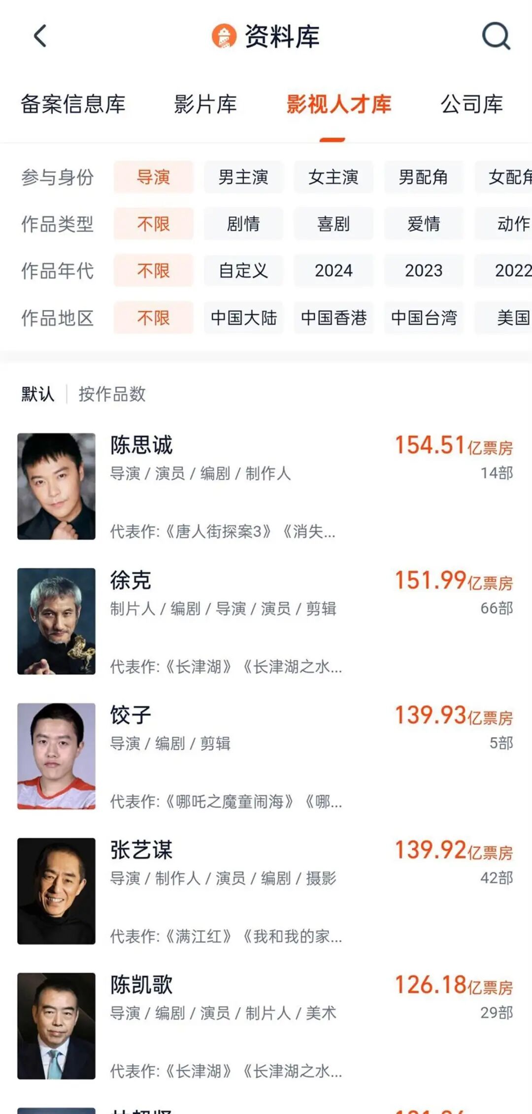 榜单显示,目前,位居导演票房榜榜首的是凭借14部作品拿下154.51亿元票房的陈思诚,第二名则是凭借66部作品拿下151.99亿元票房的徐克。