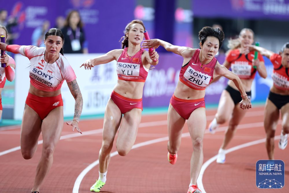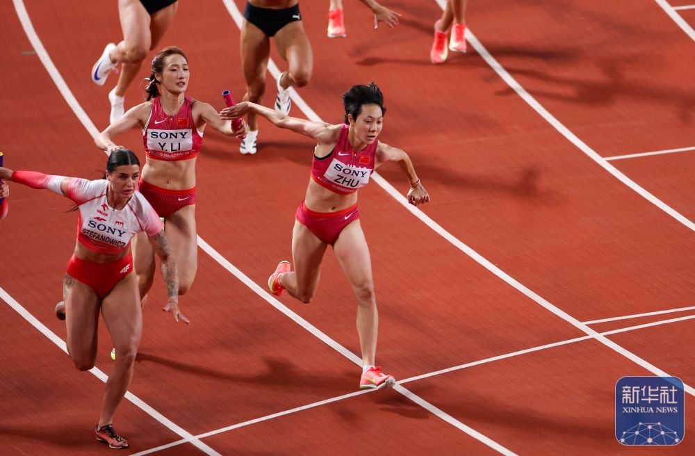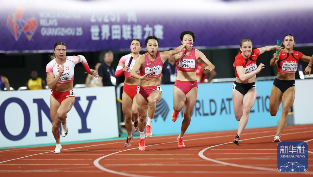↑ 中国队第三棒选手朱俊颖(右前)在比赛中。新华社记者 卢汉欣 摄