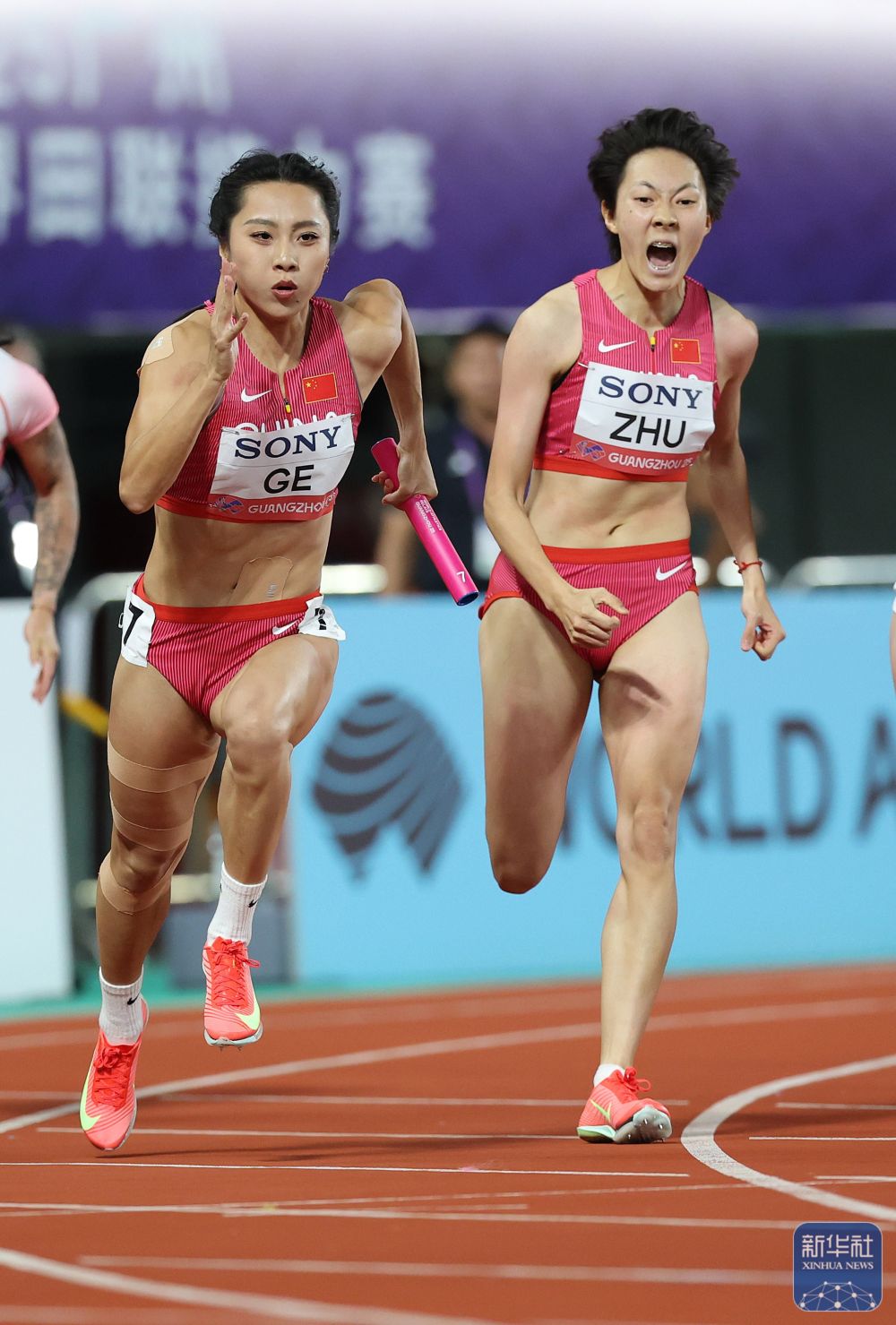 ↑ 中国队第三棒选手朱俊颖(右)与第四棒选手葛曼棋在比赛中完成交接棒。新华社记者 李明 摄