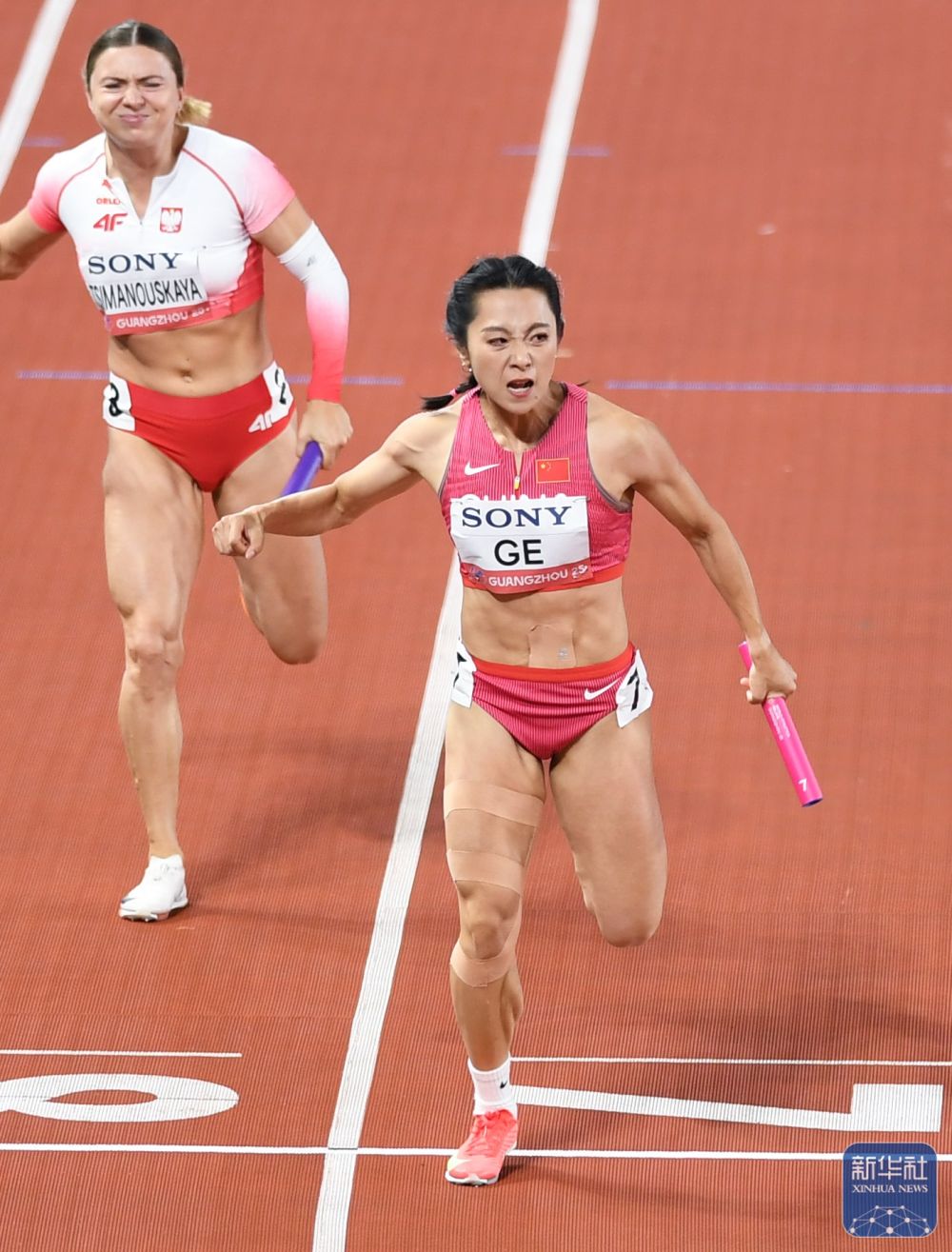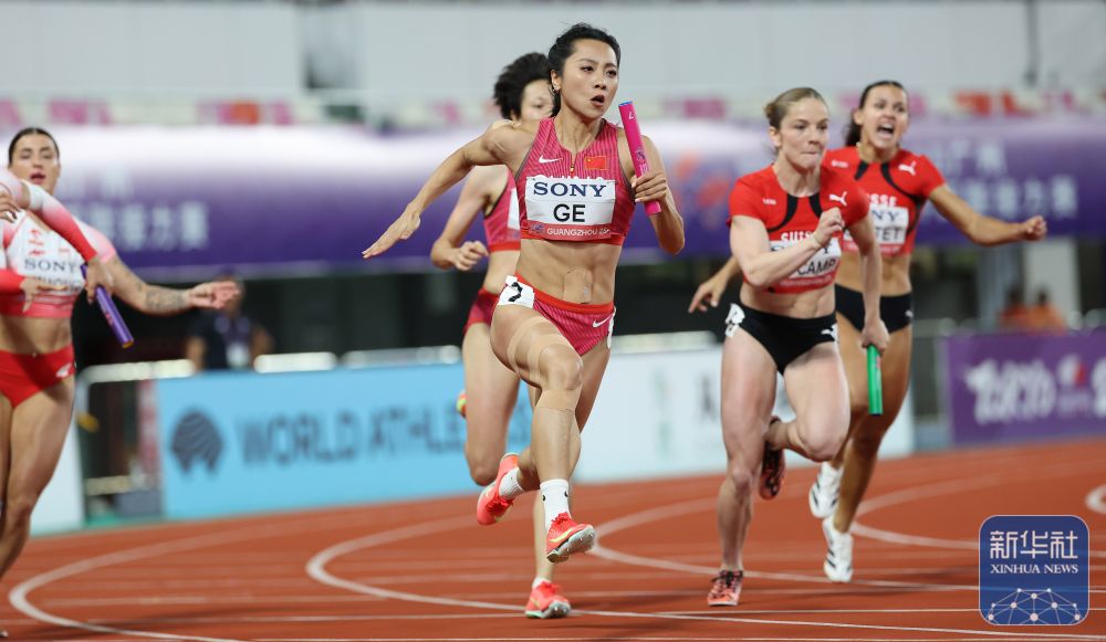 ↑ 中国队第四棒选手葛曼棋(前)在比赛中。新华社记者 李明 摄