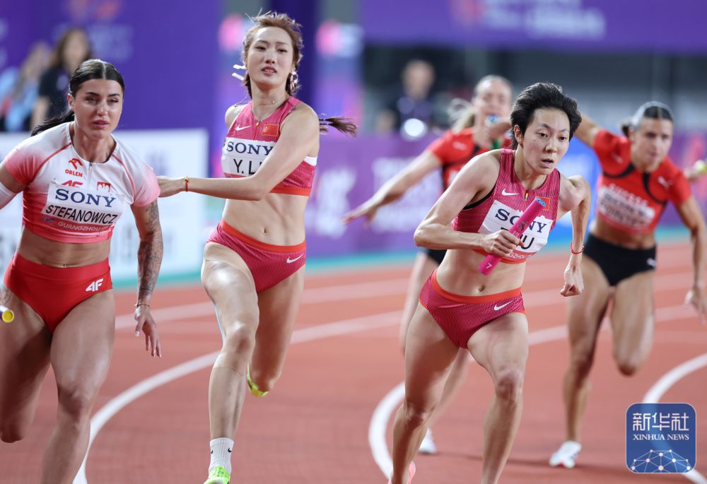 ↑ 中国队第二棒选手李玉婷(左二)和第三棒选手朱俊颖(左三)在比赛时交接棒。新华社记者 卢汉欣 摄