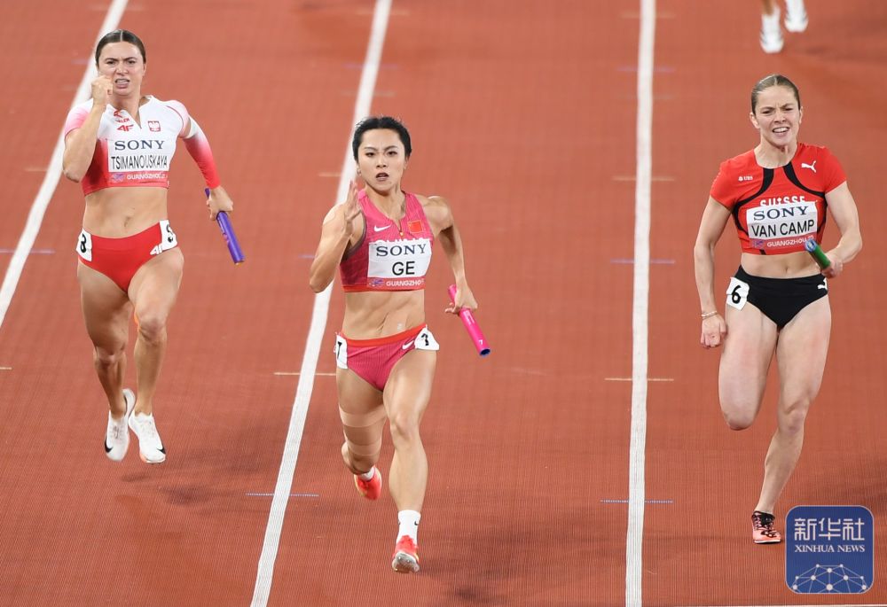 ↑ 中国队第四棒选手葛曼棋(中)在比赛中冲刺。新华社记者 邓华 摄