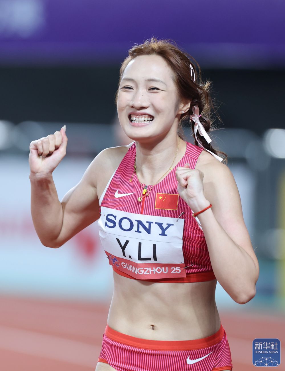 ↑ 中国队第二棒选手李玉婷在比赛后庆祝。新华社记者 卢汉欣 摄