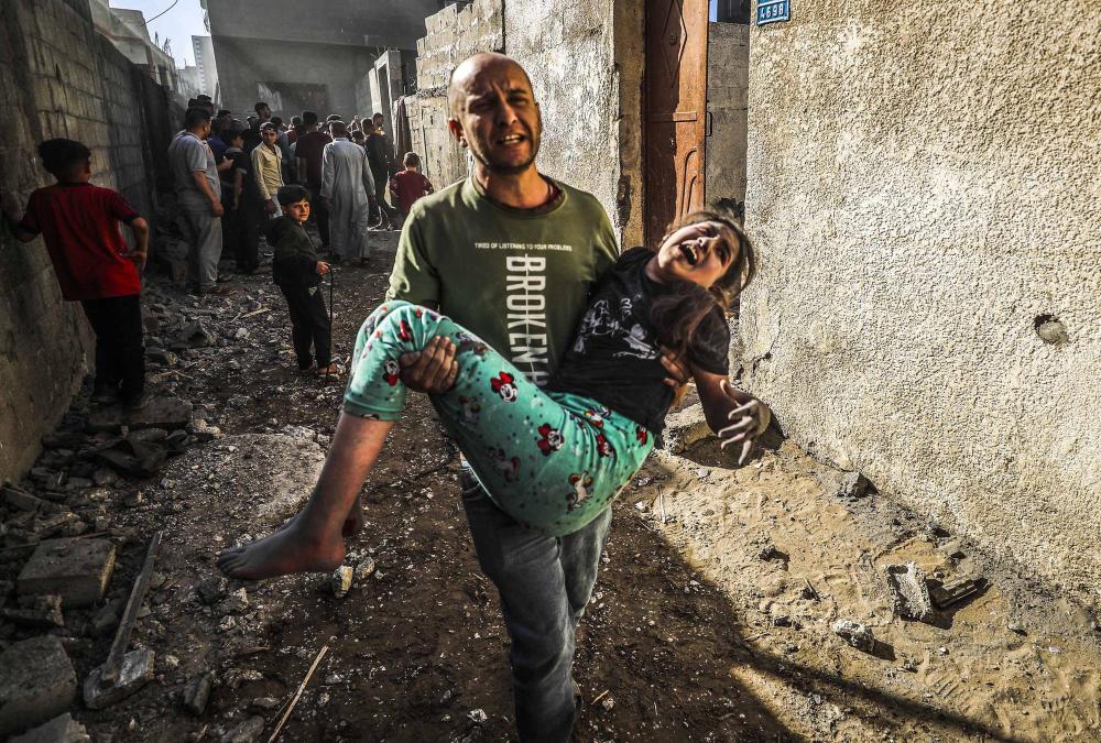5月21日,在以军空袭加沙地带北部杰巴利耶难民营所在区域后,一名男子抱着受伤的女孩寻求救援。新华社发(马哈茂德·扎基摄)