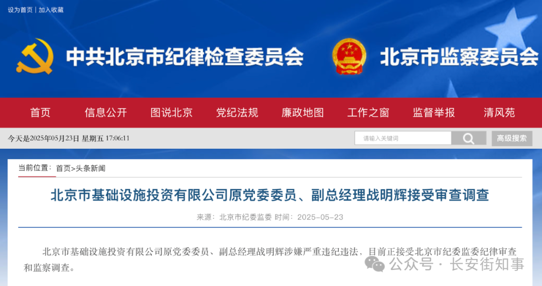 据北京市纪委监委5月23日消息,北京市基础设施投资有限公司原党委委员、副总经理战明辉涉嫌严重违纪违法,目前正接受北京市纪委监委纪律审查和监察调查。