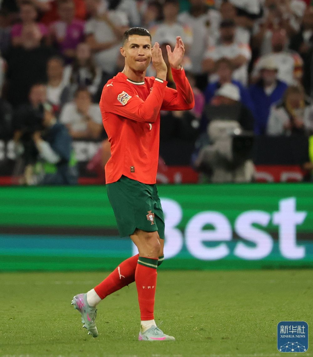 ↑葡萄牙队球员克·罗纳尔多被替换下场时向球迷致意。