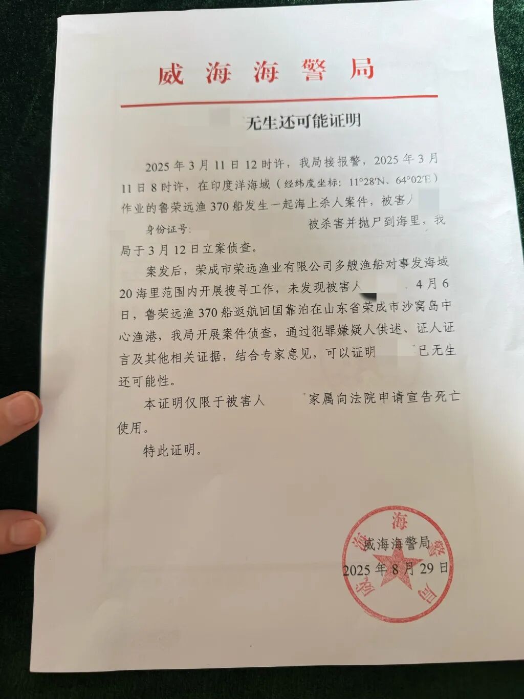 威海海警局出具的《无生还可能证明》显示,2025年3月11日12时许,该局接报警,当日8时许,在印度洋海域作业的鲁荣远渔370船发生一起海上杀人案件,被害人被杀害并抛尸到海里,该局于3月12日立案侦查。