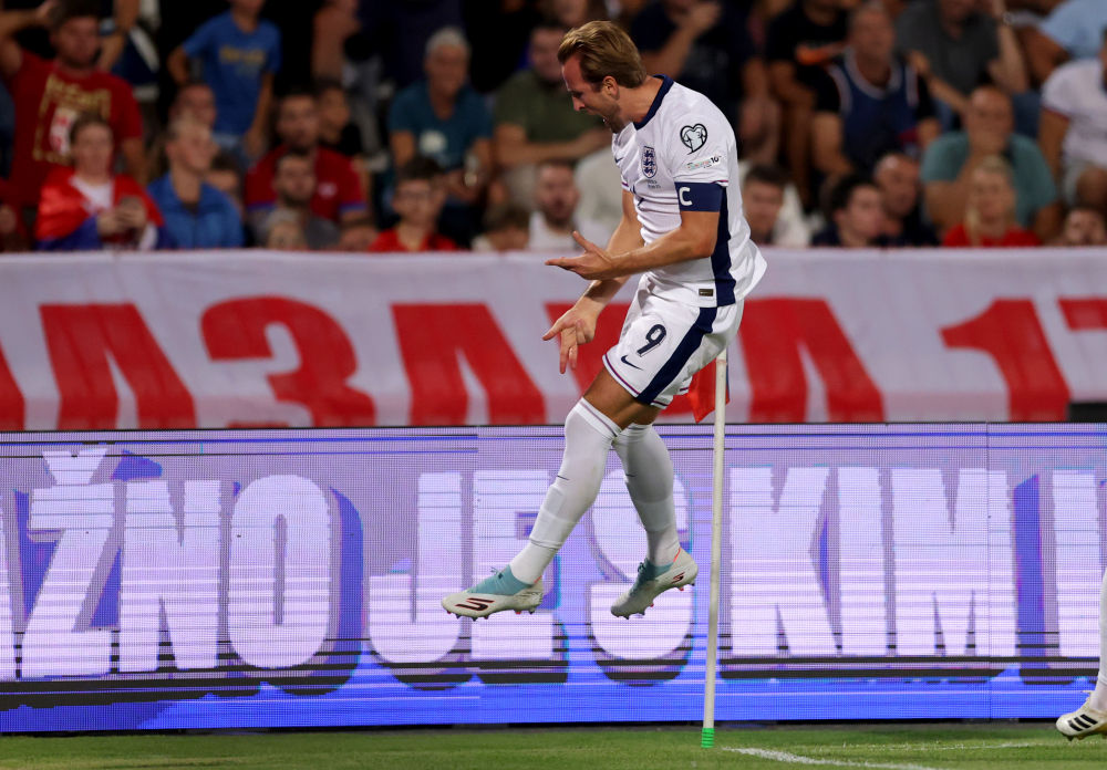 9月9日,英格兰队球员凯恩在比赛中庆祝进球。当日,在塞尔维亚贝尔格莱德举行的2026年美加墨世界杯欧洲区预选赛第一阶段小组赛第六轮比赛中,英格兰队客场5:0战胜塞尔维亚队。新华社发(普雷德拉格·米洛萨夫列维奇 摄)