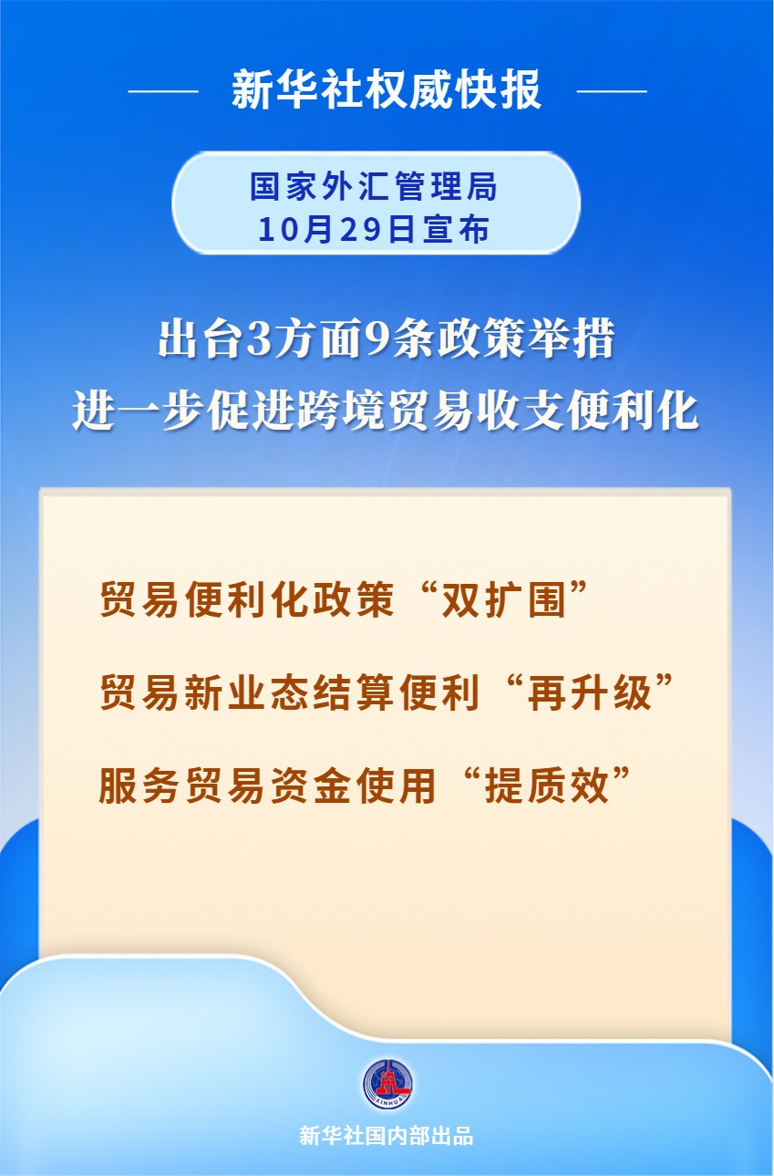 国家外汇管理局10月29日对外发布三方面九条政策举措,进一步促进跨境贸易收支便利化,积极支持对外贸易发展。