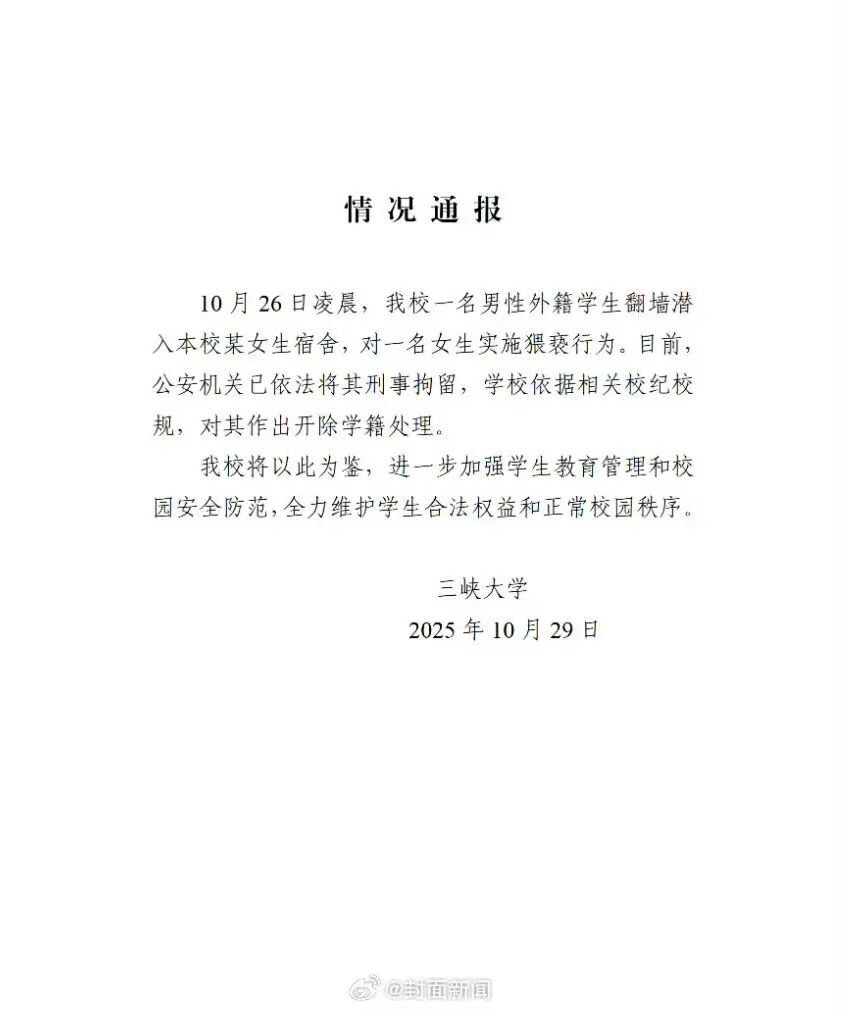 男性外籍学生翻墙潜入女生宿舍,对一女生实施猥亵,三峡大学通报:开除学籍