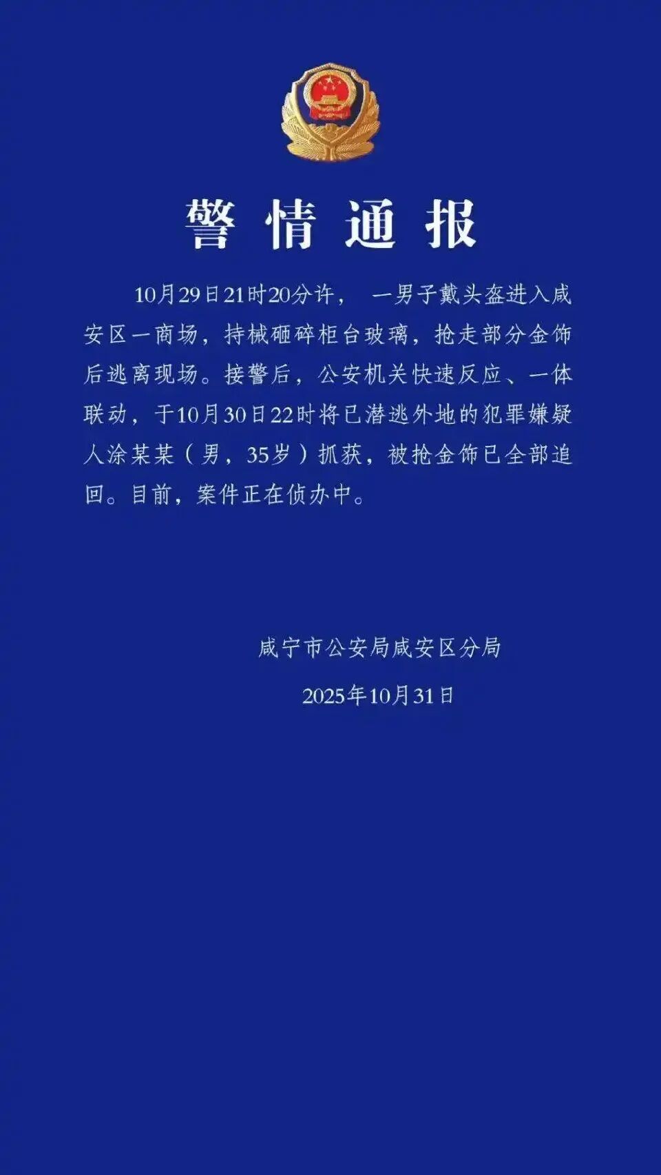 近日,湖北咸宁一商场两家金店被打劫后,警方迅速破案将被抢黄金送还引发关注。