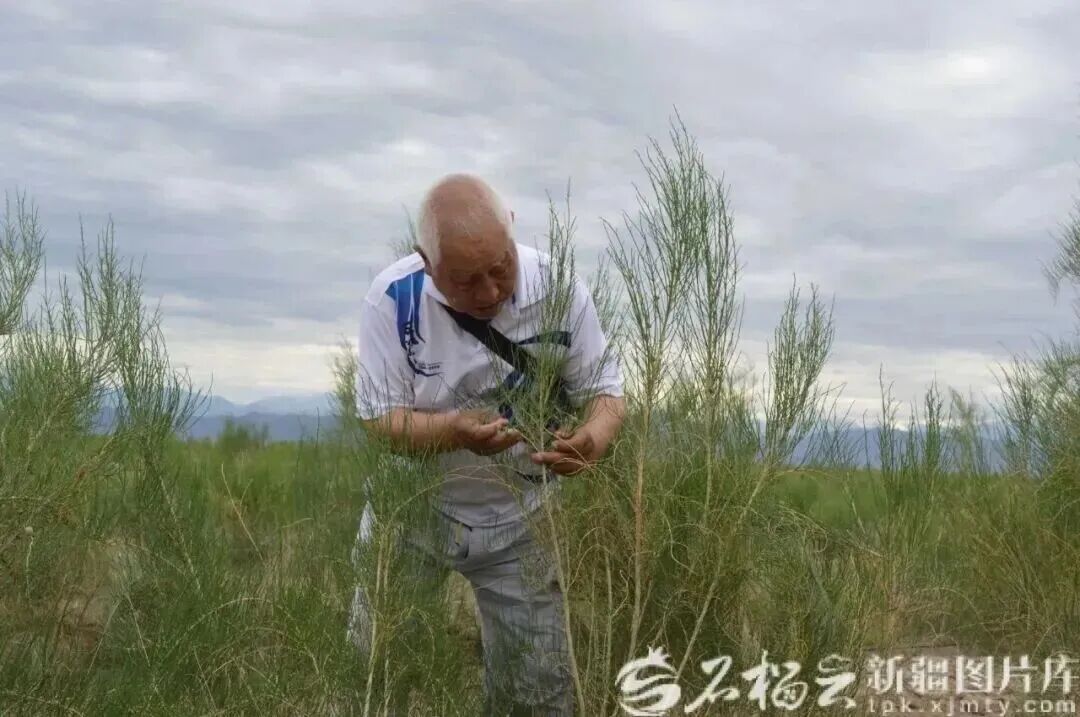 刘铭庭在察看红柳生长情况