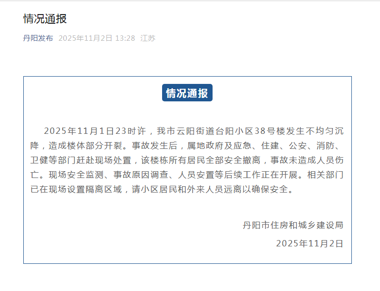 11月2日,据江苏丹阳发布“情况通报”: