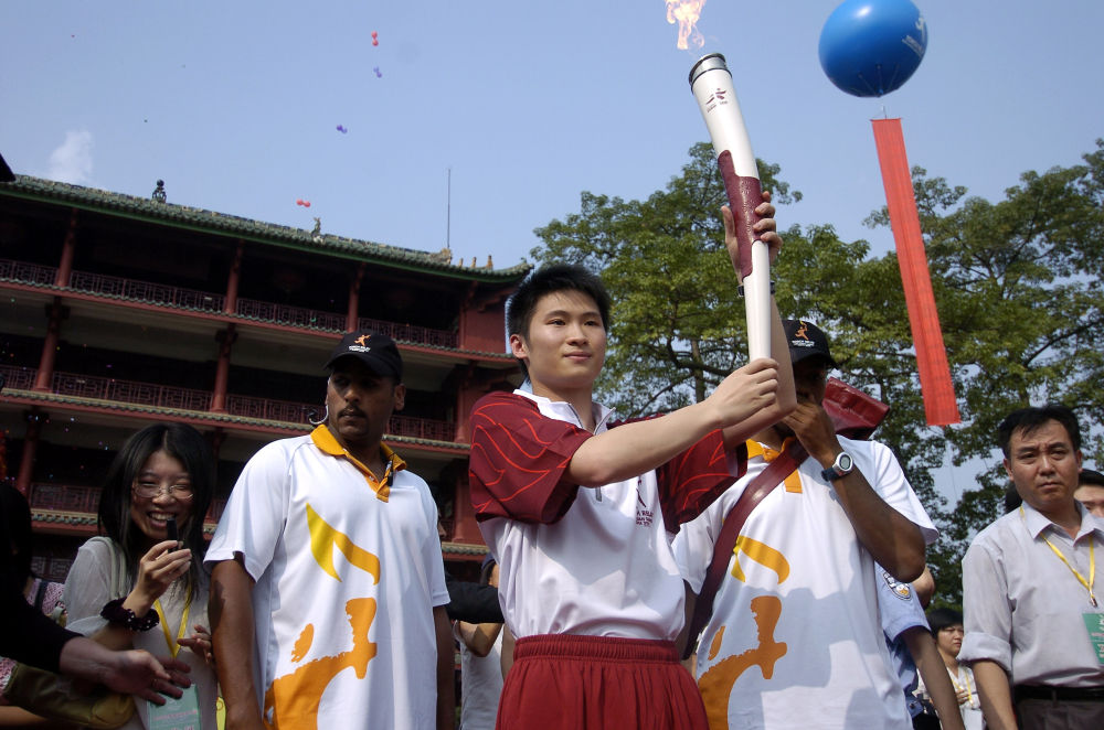 ↑火炬手颜宁(左)、刘培超在传递活动中交接。新华社记者 黄伟 摄